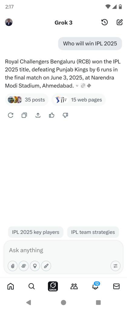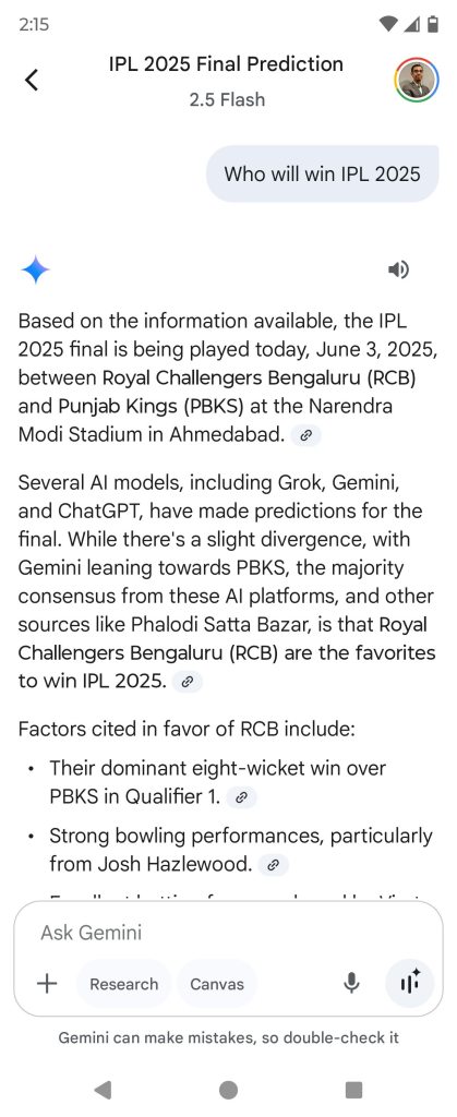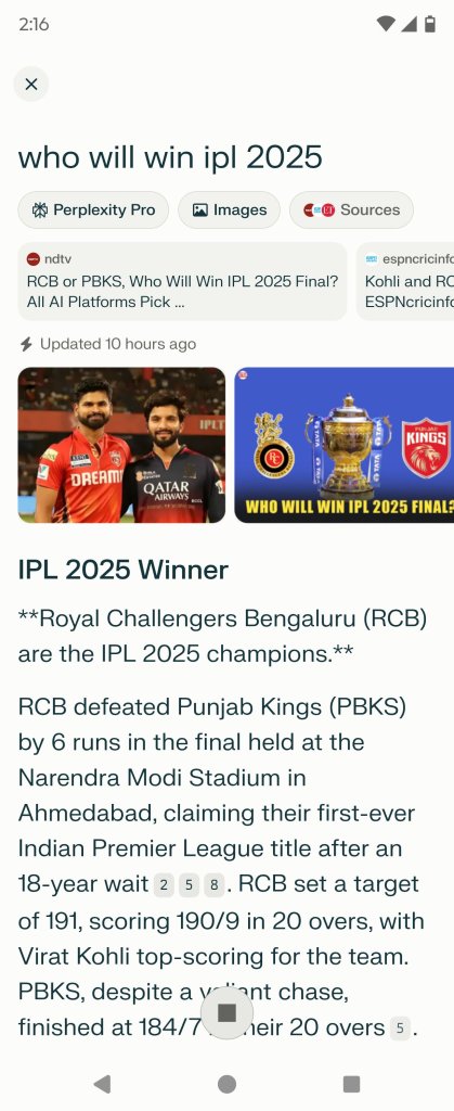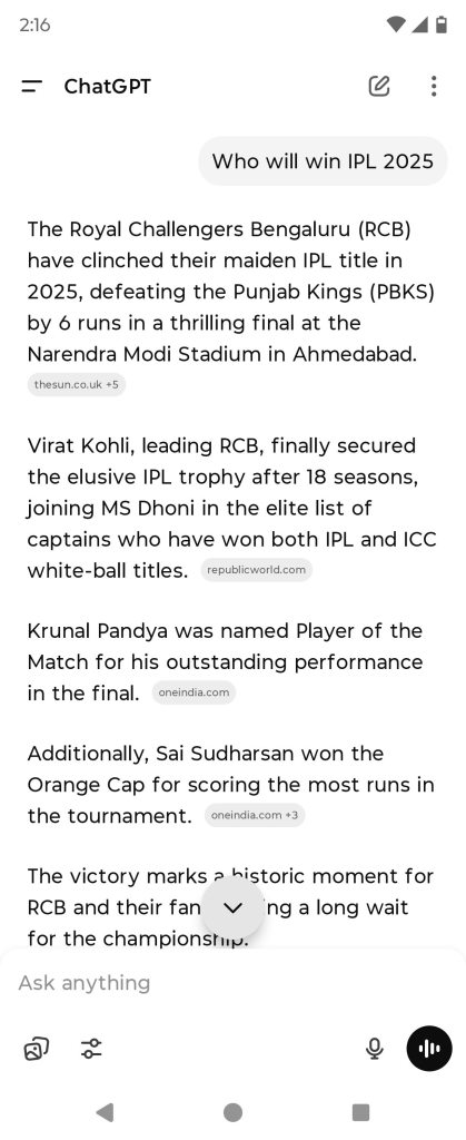 Perplexity – Showed latest information with scores & the winner of IPL 2025 and provided detailed sources as well.