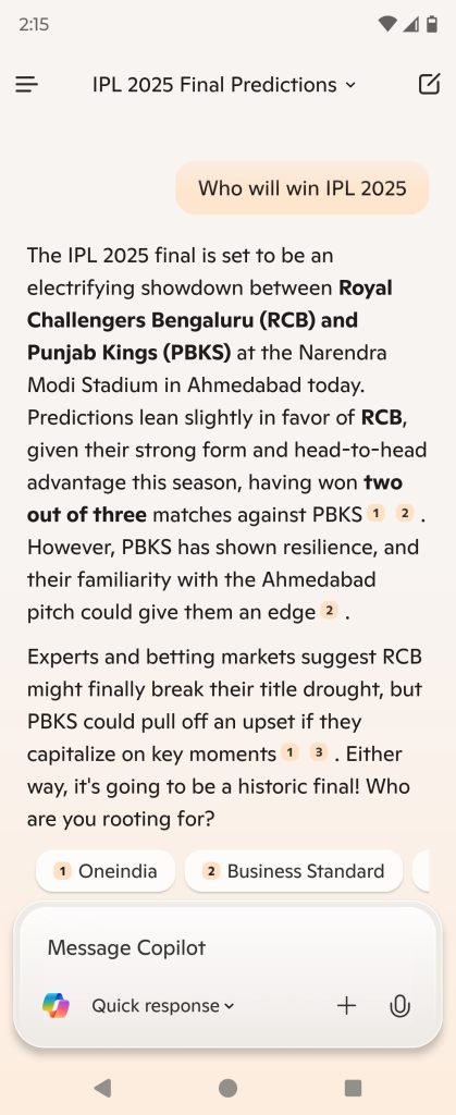 The prompt was asked just after the final of IPL 2025 was finished. The idea of the prompt was to test AI agent for latest information and also convert the prompt which is asking for prediction to actual result as the match is completed.