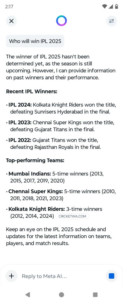 Meta AI – Just showed old information of previous winners. No information on latest IPL 2025 and teams as well.
